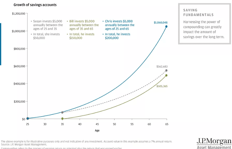 Another form of opportunity cost of debt relates to the number of years that you have available for building wealth. If are paying off debts and delay investing, the amount that you will have to invest to reach a goal gets larger. The following chart shows a famous example. One person saves $5,000 per year between age 25 and 35, and then just leaves that amount invested until retirement at age 65. The other person starts investing $5,000 per year at age 35 and continues to invest this amount until age 65. The first person contributed a total $50,000 and the second person contributed a total of $150,000. If these investors earn 7% per year on their accounts, the person who saved $50,000 early will have more at retirement than the person who saves $150,000 starting later.