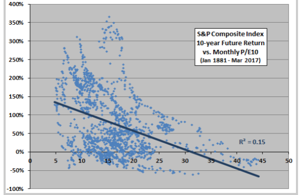 A common way to look at the relationship between P/E 10 and and subsequent returns is by looking at all possible 10-year return periods and the P/E 10 that they started from. An example is below.