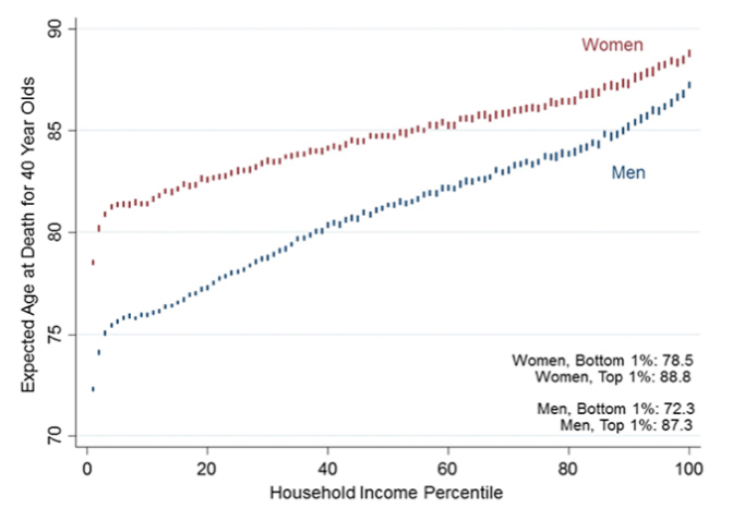 There are still significant differences between households at the 40th percentile of income and those at the 90th. Men in households at the 40th percentile of income live an average of 5 fewer years than those at the 90th percentile, for example.