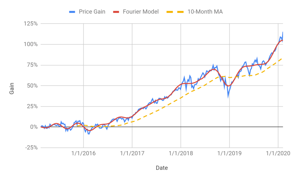 Trend following in stock and index prices has a long and well-established history. I reviewed some of the background in a past article on this topic. For additional examples see this article. As explained in these pieces, trend following is all about separating the low-frequency persistent part of price variability from the high-frequency part, which may be thought of as the ‘noise’ of transient effects. Moving averages are one type of trend-following model. Another approach, which I favor, is Fourier analysis. Fourier methods involve the decomposition of a data series (prices, in this case) into a series of periodic terms (waves). I calculate the trend using the strongest / most significant time scales in the Fourier analysis. This does not mean that there are, in fact, periodic elements in price series. The Fourier analysis simply allows an estimation of the robustness of different times scales.