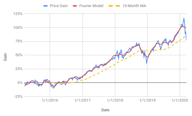 One of the tools that I employ in following markets is Fourier analysis, using a method I have discussed in a range of recent posts. The basic idea is to separate longer-timescale trends and changes in trends from short-term noise. The charts below show this analysis for the S&P500 (SPY) and the NASDAQ 100 (QQQ) through March 13. Two things are evident when contrasted with a similar analysis in mid-February. First, the Fourier trend is now sloping down rather than up. Second, the current prices on these two indexes are well below that trend. This suggests that the markets will continue to be volatile (indicated by how far current prices are below the Fourier model), but are also trending lower overall.