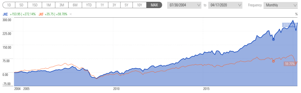 The iShares Large Cap Growth ETF (JKE) has absolutely crushed the iShares Large Cap Value ETF (JKF) since inception and this relative performance is representative of the major indexes. In fact, growth has out-performed value over every recent time horizon. For the year to date, JKE is down 1% but JKF is down almost 19%.