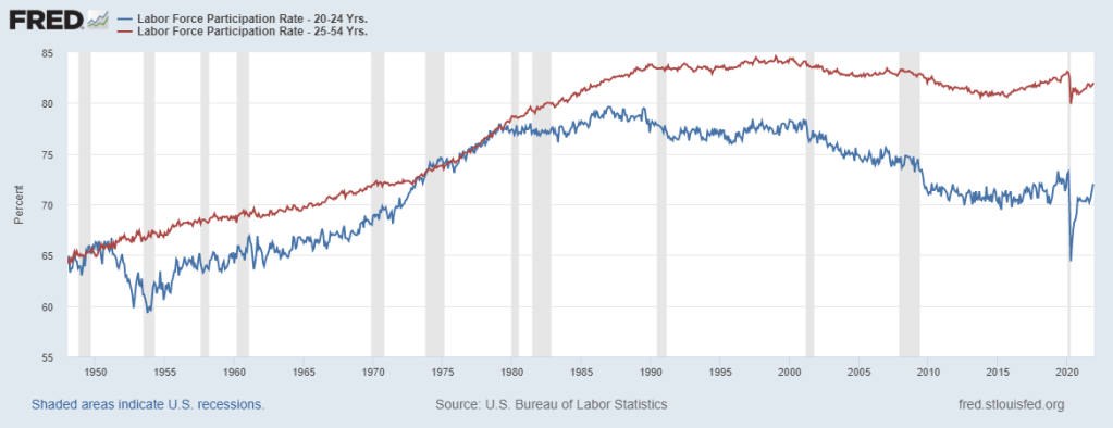 While Millennials and Gen Z’ers tend to hold jobs for shorter periods of time than older people, it is not clear that younger workers are leaving the workforce in The Great Resignation–they are just job hopping. The labor force participation rate for people aged 25-54 is currently 81.9% and is rebounding rapidly from the COVID-driven decline. The labor force participation rate for people aged 20-24 has been declining for years, largely due to increased time in higher education, but has bounced back sharply from COVID and is approaching the pre-pandemic level.