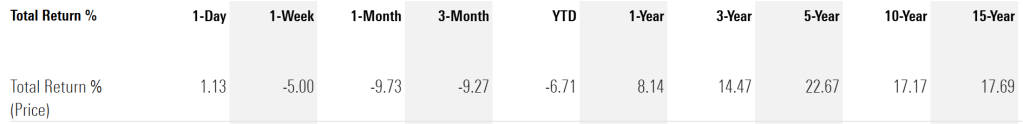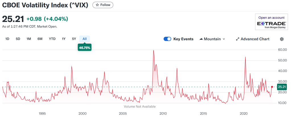 Looking at VIX over several decades, the current value, while well above the average, is not especially high as compared to other periods of market stress. During the COVID-driven market swoon and the 2008 financial crisis, VIX went above 50, for example.